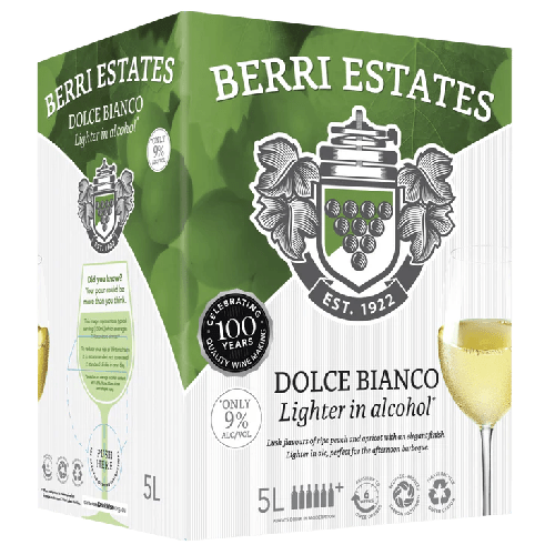 Berri Dolce Bianco is a delicious, light, fruity styled sweet wine modelled on the famous Italian style. Conveniently packaged in the 5L cask, it’s perfect for functions or to be enjoyed with friends on a lazy Sunday afternoon.