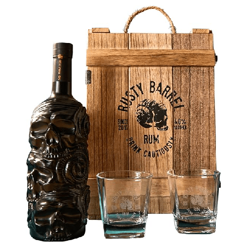 Rusty Barrel Gold Rum Gift Set Indulge in the rich, complex flavours of Rusty Barrel Gold Rum with this premium gift set, presented in a natural wooden box – perfect for gifting or savouring yourself. This deluxe set includes: 700ml Rusty Barrel Gold Rum: A carefully crafted blend of 5 and 8-year-old Caribbean gold rums, aged in Bourbon barrels. Developed in collaboration with an international master distiller, this rich and complex rum features smooth vanilla and oak aromas, along with fruity notes of plums, raisins, and subtle floral undertones. The palate offers delicate sweetness with hints of honeycomb and buttery biscuits. 2 Rusty Barrel Glasses: Designed to enhance your sipping experience. Details: Size: 700ml ABV: 40% Best served straight over ice or in your favourite cocktail. Crafted for those who appreciate a fine sipping rum or a standout cocktail base, this set is perfect for those who enjoy quality and complexity in every pour. Drink cautiously.