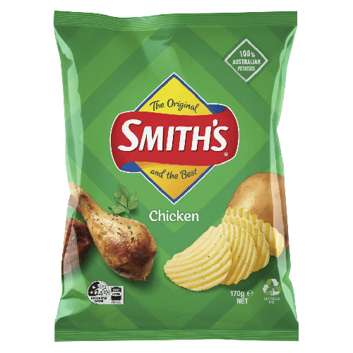 Smith’s® Crinkle Cut Chicken Chips 170g are the perfect pick for all snack lovers! These large, tantalisingly tasty chips are made from the finest Aussie potatoes, peeled and sliced to achieve that perfect crinkle cut chip thickness. They are then cooked in healthier oils featuring 75% less saturated fat, maintaining a delicious and healthier snack option. Each chip is generously coated in Smith’s® famous chicken flavour and seasoning, ensuring a mouthwatering taste in every bite. Perfect for sharing, this 170g bag is suitable for work, school, home, parties, and events. Remember, you know you love ‘em! Don’t hesitate, grab a bag today!