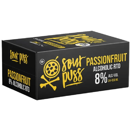 Sour Puss Passionfruit Alcoholic RTD 330ml is a bold, refreshing ready-to-drink that delivers a perfect balance of tangy sourness and tropical sweetness. Bursting with vibrant passionfruit flavor, this chilled alcoholic beverage offers a smooth, easy-drinking experience with a playful, mouth-watering twist. Conveniently packaged in a 330ml can, it’s ideal for parties, casual get-togethers, or anytime you’re craving something fun, fruity, and refreshingly different. Best enjoyed ice-cold.